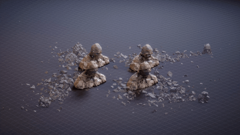 Redirectable VATs (vertex animation textures) are an alternative to expensive real-time destruction solutions such as Chaos, while maintaining a higher level of interactivity than a regular vertex animation texture method. In this example, I explore rotating simulated pieces based on a projectile's direction of impact.