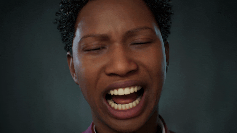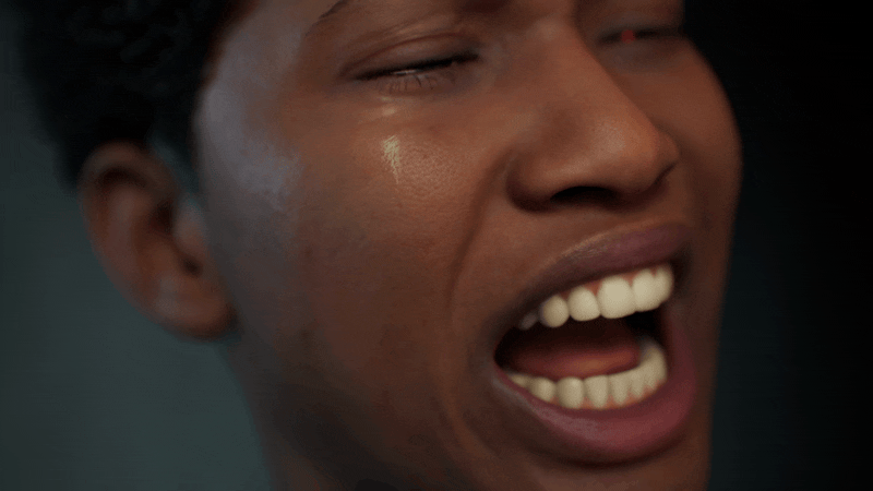 The teardrop effect is achieved by modifying the normals, roughness and specular of the skin material, using textures baked from a 3d geometry in Houdini