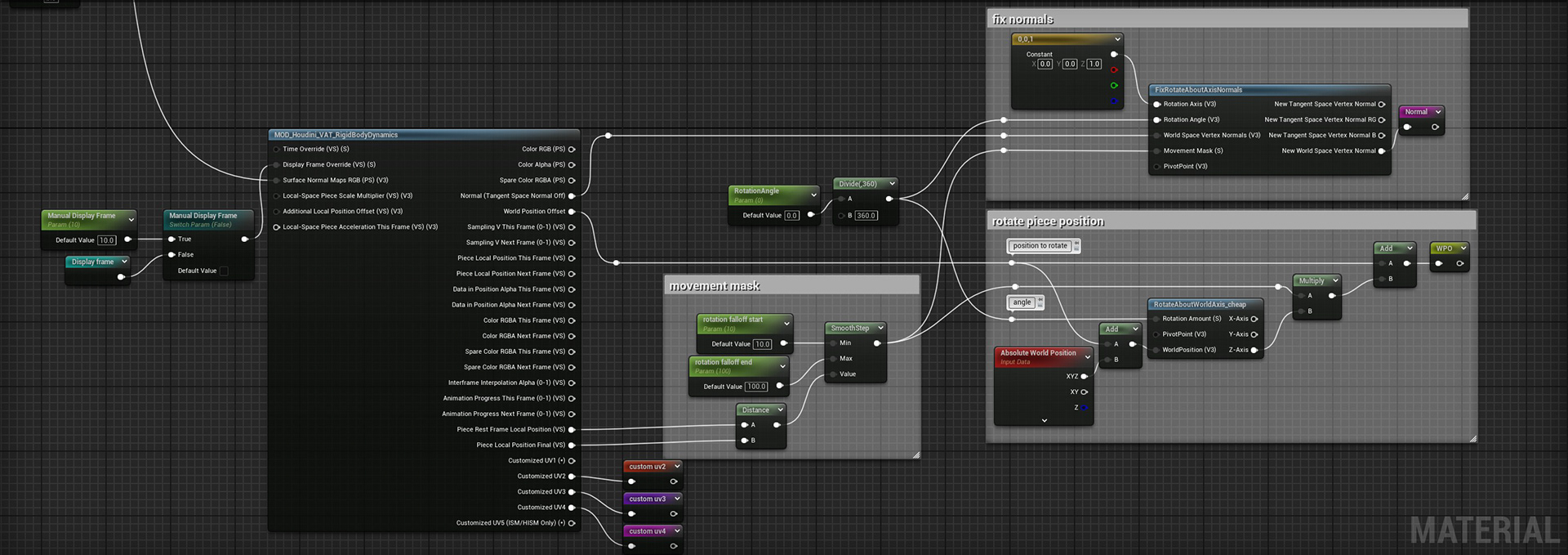 Modified the Houdini VAT Material Function using impact data to control Break Time (when destruction starts) and angle (simulation direction).